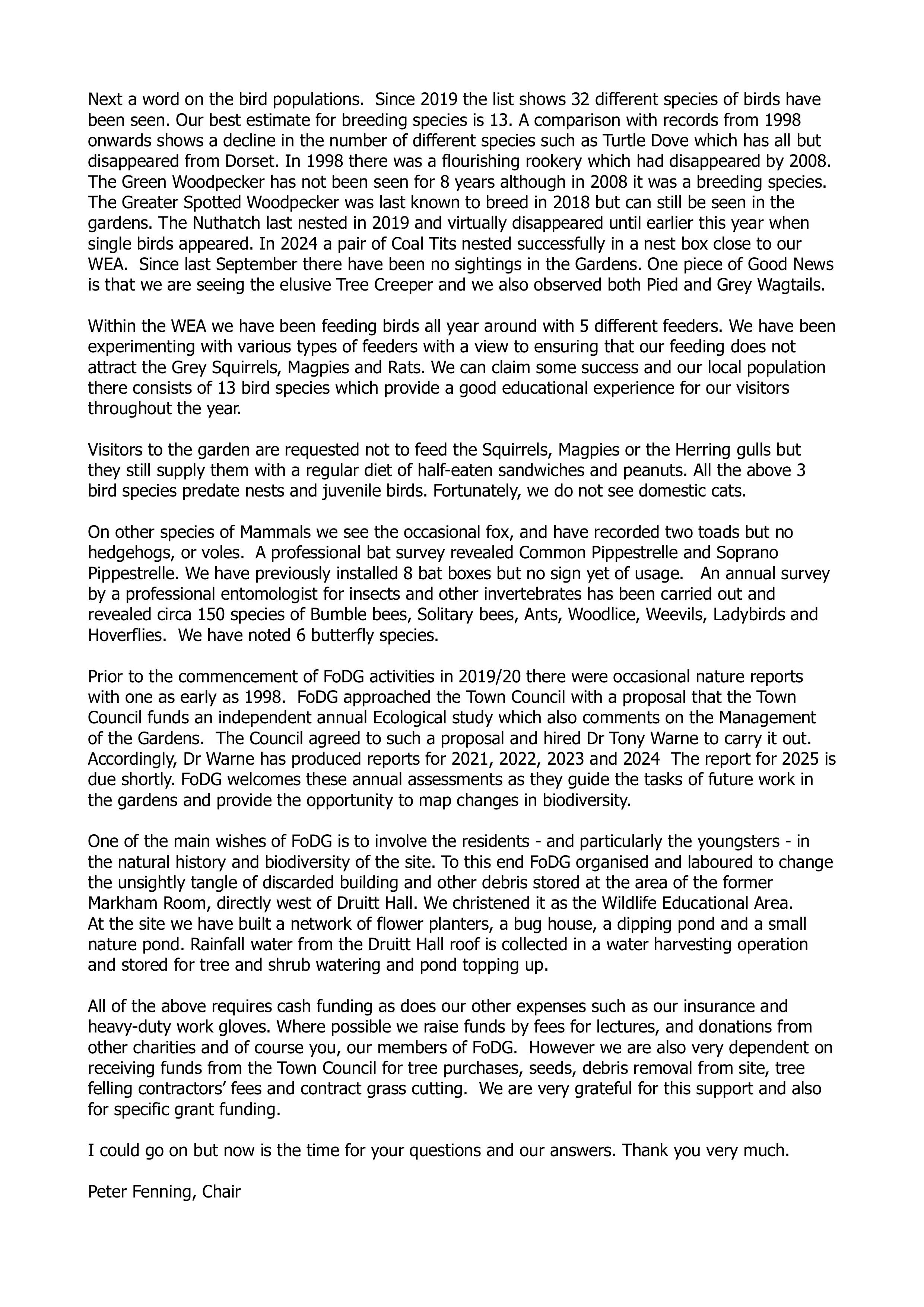 a 'Wildlife Education Area' at the rear of Druitt Hall. They have successfully encouraged an increase in the bird population,
